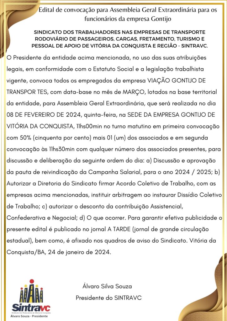 EDITAL DE CONVOCAÇÃO :Assembleia Geral Extraordinária, que será realizada no dia 08 DE FEVEREIRO DE 2024, quinta-feira empresa VIAÇÃO GONTIJO
