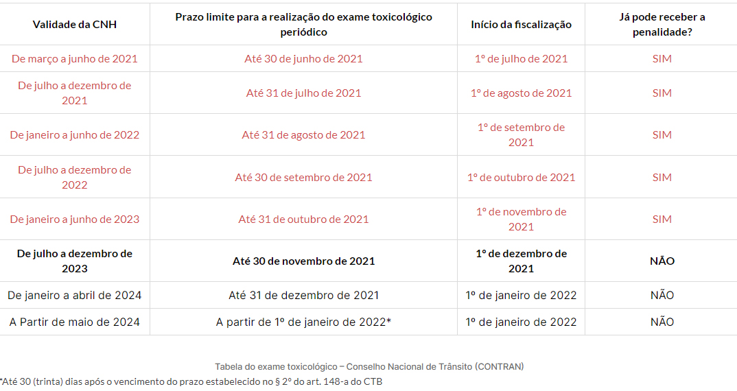 Além disso, quem não estiver com exame toxicológico em dia pode receber 7 pontos no prontuário. Bem como ficar sujeito a ter a CNH suspensa por três meses. Seja como for, essas penalidades deveriam ter entrado em vigor em abril de 2021. Ou seja, todos os motoristas tiveram mais de seis meses para regularizar a situação.