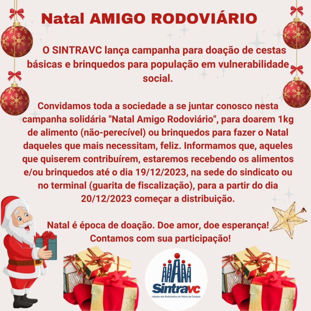 NATAL AMIGO RODOVIÁRIO: O SINTRAVC lança campanha para doação de cestas básicas e brinquedos para população em vulnerabilidade social.