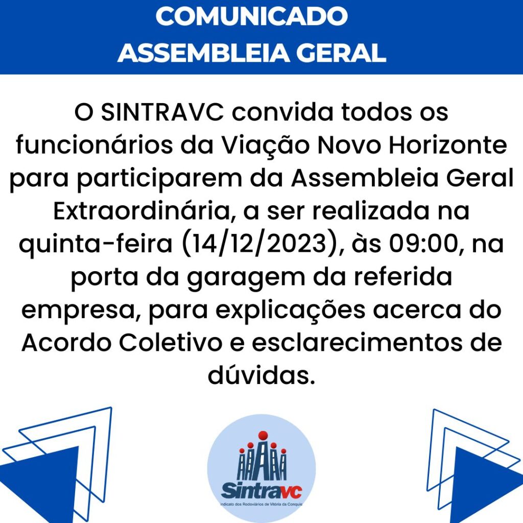 O SINTRAVC convida todos os funcionários da Viação Novo Horizonte para participarem da Assembleia Geral Extraordinária
