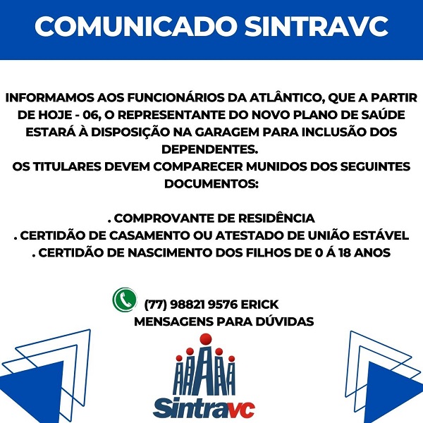 SINTRAVC faz um comunicado aos funcionários da Empresa Atlântico referente ao novo Plano de Saúde