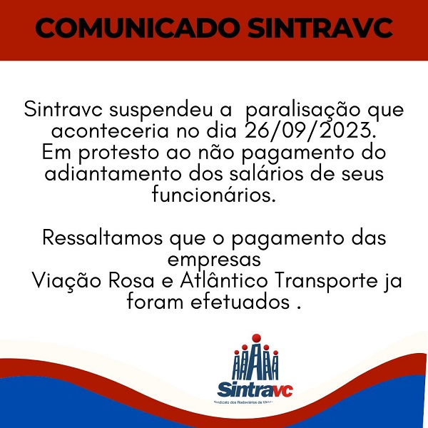 Sintravc suspendeu a paralisação que aconteceria no dia 26/09/2023.